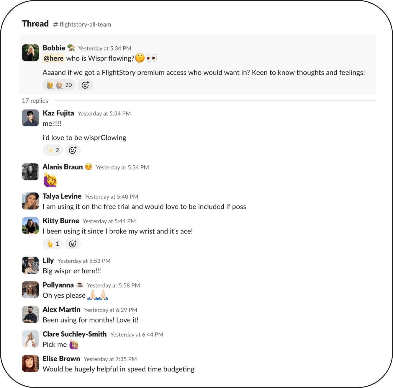 The impact didn't stop with Steven. After seeing the difference Flow made to his communication speed and quality, the wider FlightStory team adopted it across the organization. When the team was asked in their all-hands Slack channel who was interested in using Flow, the response was immediate: