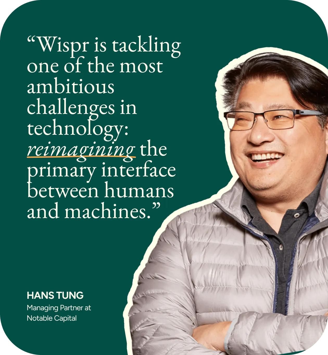 Hans Tung at Notable joins our board. A 13-time Forbes Midas Lister, Hans has been an early backer of companies like Affirm, Airbnb, Slack, Coinbase, Anthropic, and TikTok, businesses that redefined how people shop, work, and communicate, and valued at over $100b collectively today. Hans has a history of investing in the technologies that become everyday habits, and his belief in us is evidence that Wispr is on that same path.