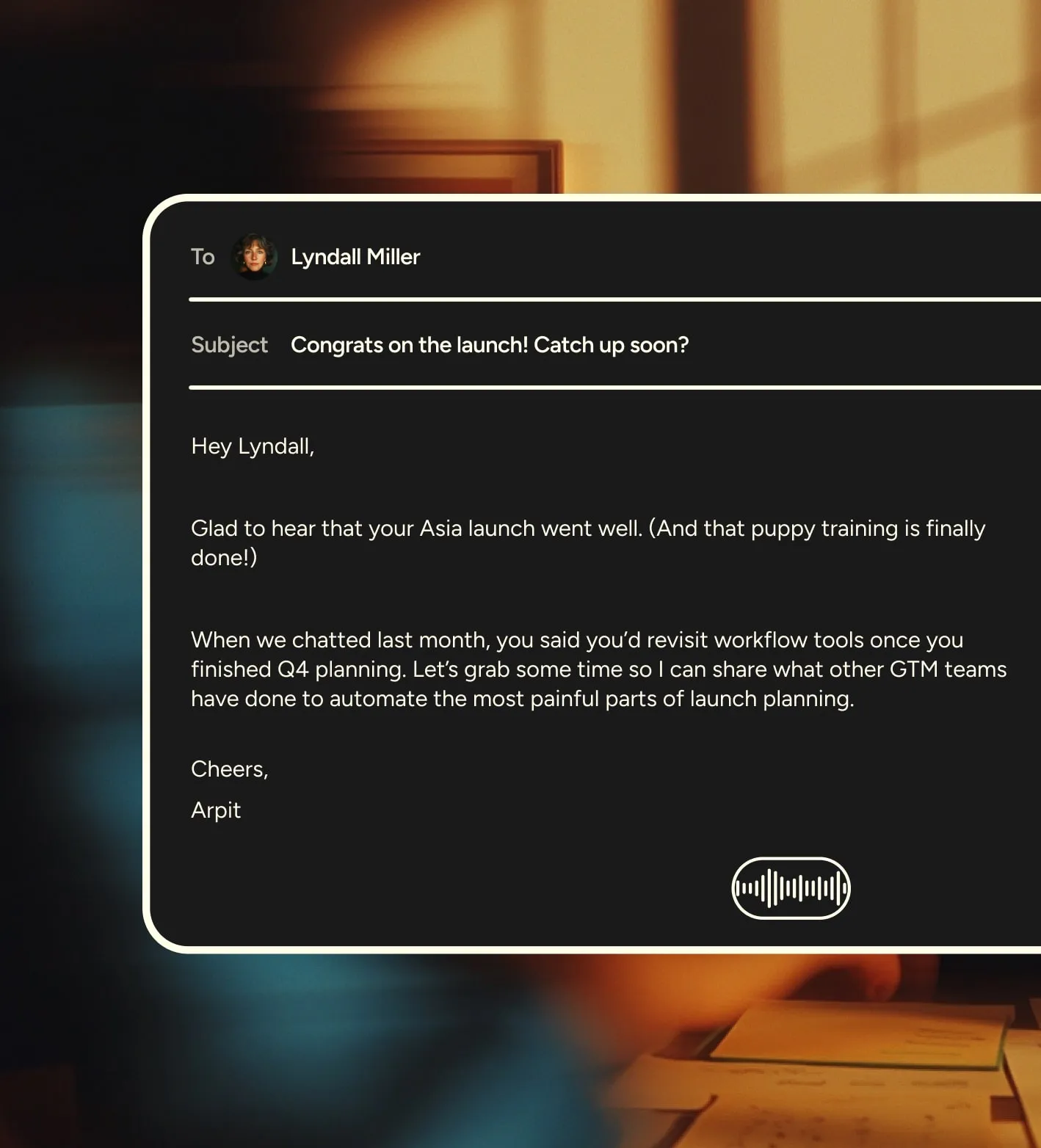 Capture the thoughts that move deals forward, even if you’re on the go. Dictate your next proposal outline, meeting recap, or ChatGPT prompt.