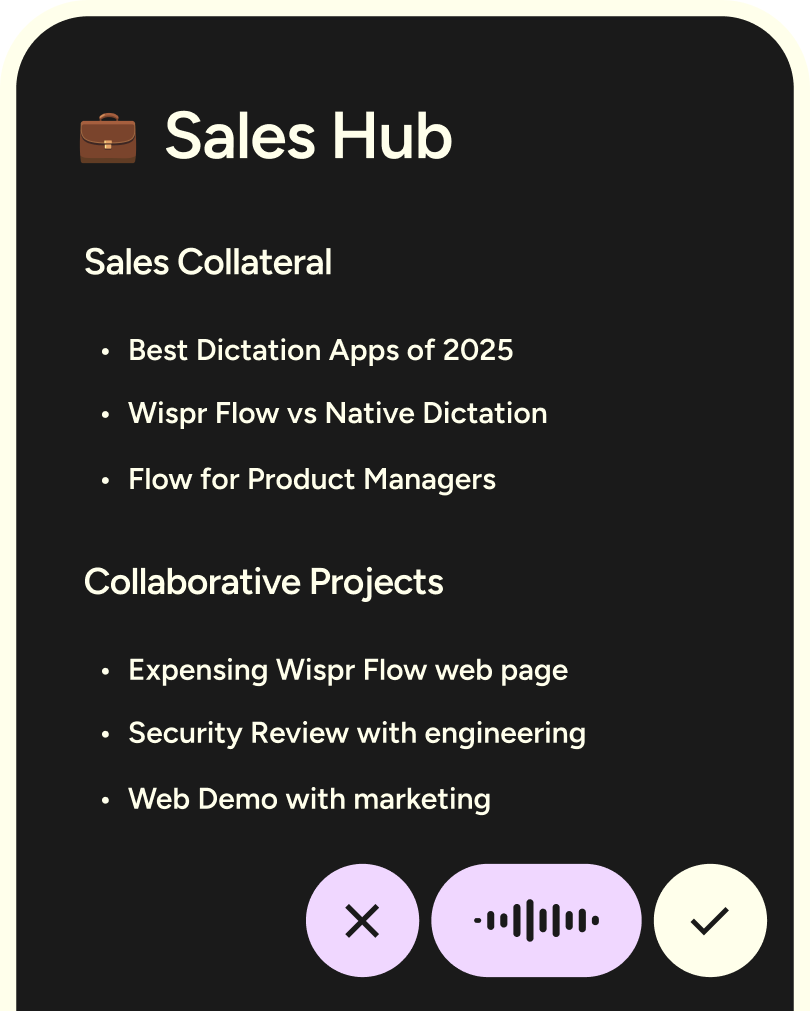 After every call, capture next steps before the energy fades. Dictate your follow-up in seconds, and Flow formats it perfectly for email, LinkedIn, or Slack.
